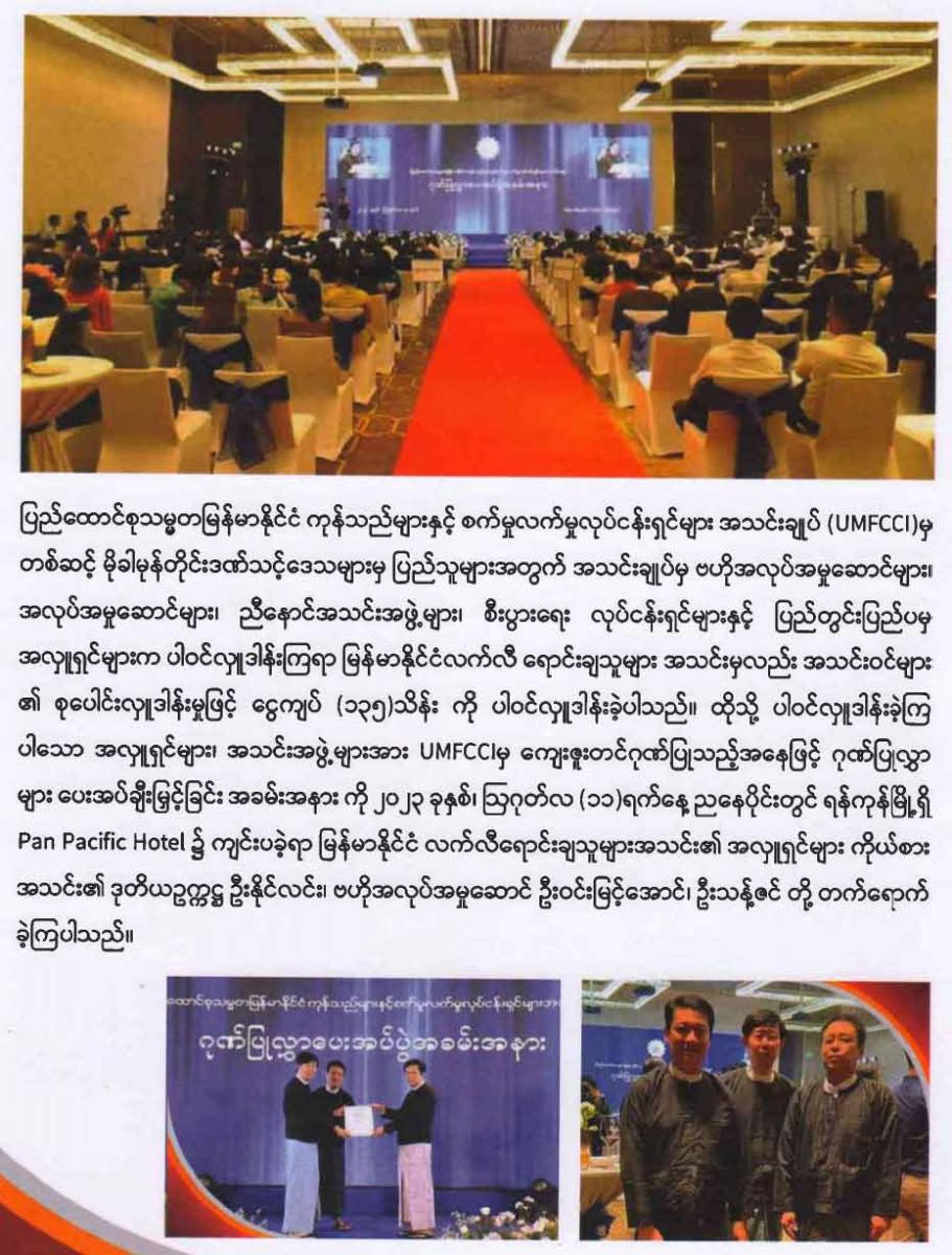 မိုခါမုန်တိုင်းဒဏ်သင့်ဒေသများသို့ အလှူငွေနှင့် အလှူပစ္စည်းများ လှူဒါန်းသည့်အတွက် ပြည်ထောင်စုသမ္မတမြန်မာနိုင်ငံ ကုန်သည်များနှင့်စက်မှူလက်မှူလုပ်ငန်းရှင်းများအသင်းချုပ်မှ ဂုဏ်ပြုလွှာ ပေးအပ်ခြင်း