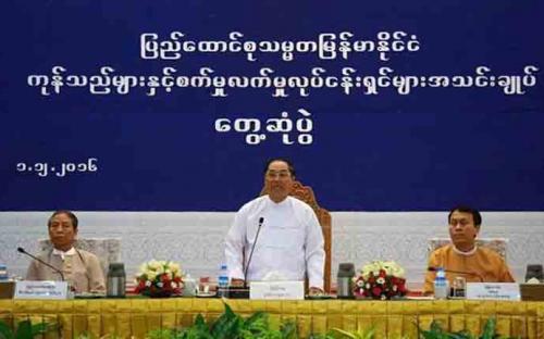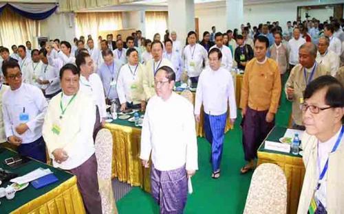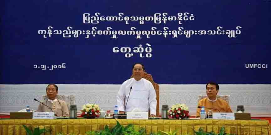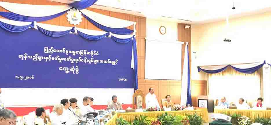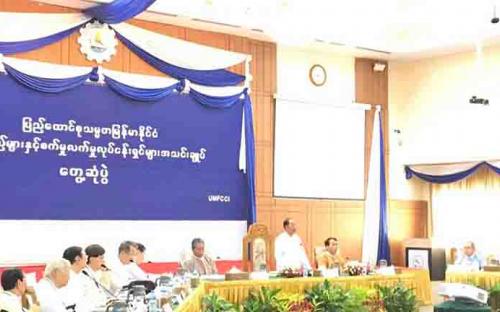 ျပည္ေထာင္စုဝန္ႀကီးႏွင့္ ျမန္မာ့စီးပြားေရးလုပ္ငန္းရွင္မ်ား ပံုမွန္ေတြ႕ဆံု ေဆြးေႏြးပဲြ ကို ျပည္ေထာင္စု သမၼတျမန္မာႏိုင္ငံ ကုန္သည္မ်ား ႏွင့္ စက္မႈလက္မႈလုပ္ငန္းရွင္းမ်ားအသင္းခ်ဳပ္တြင္ က်င္းပ ျပဳလုပ္